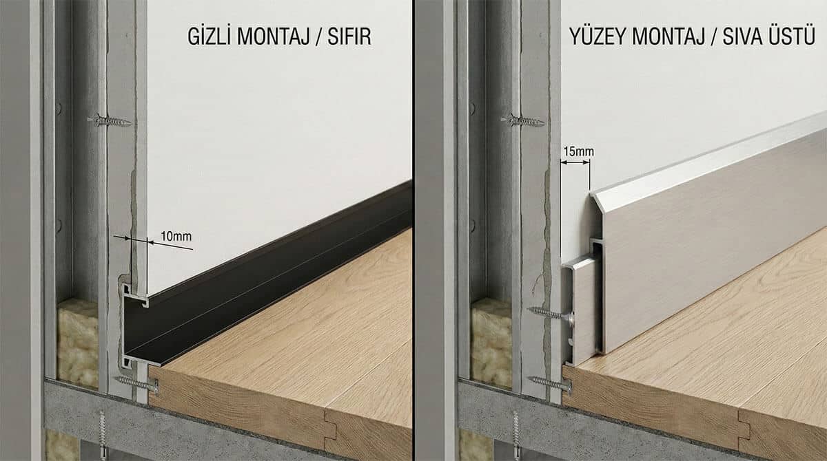 Sıva altı (hem yüz) süpürgelik detayı ve standart yüzey montaj süpürgelik kesit karşılaştırması